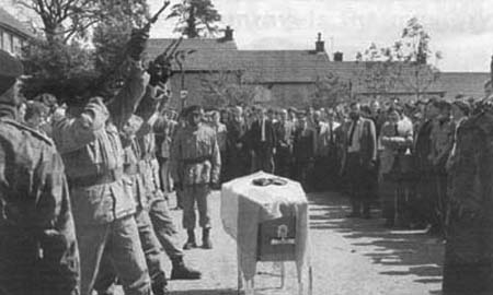 IRA firing party gives a salute over Kieran Doherty's coffin.