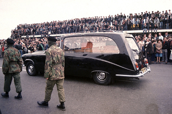 The hearse carrying McDonnell's coffin, with its IRA escort, makes its way to Milltown.