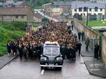 The hearse carrying Bobby Sands proceeds to Milltown with a massive crowd following on foot.